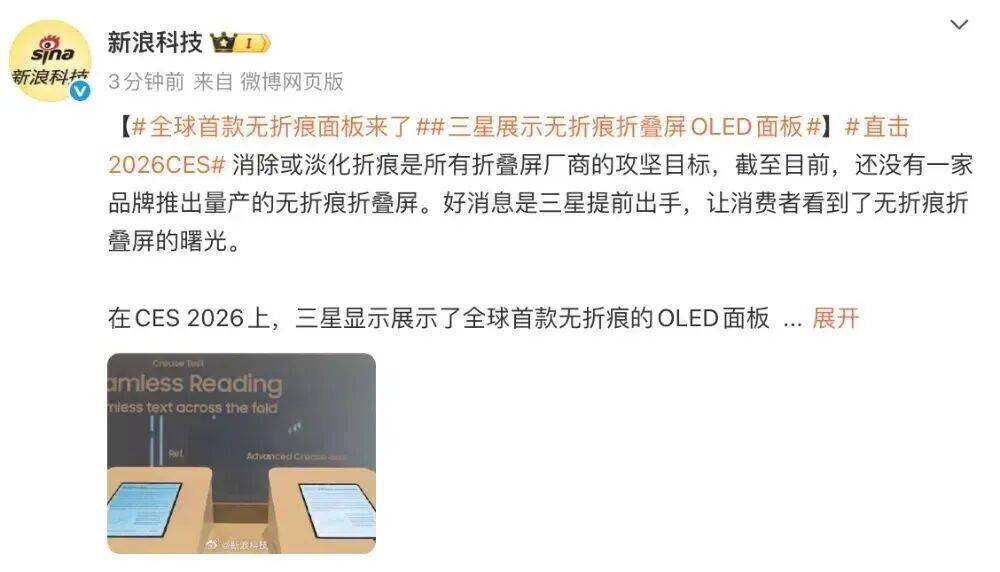 另外,参考新浪科技的报道来看,三星显示在CES 2026上展示了全球首款无折痕的OLED面板=,消息称这块屏幕将由自家的Galaxy Z Fold8首发搭载,苹果首款折叠屏iPhone Fold也可能使用这块屏幕。