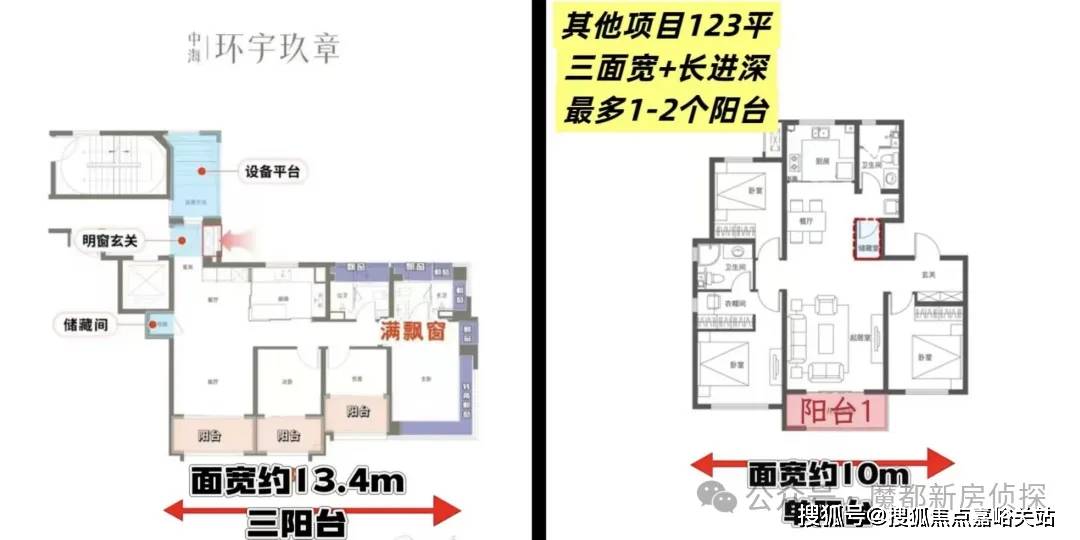 建面约123㎡的户型,做了南向三个阳台,碾压常规的一个阳台/双阳台户型。并且阳台买1得2,飘窗全赠送。